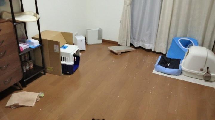 昨日から新しく使った、軽~いマシュマロみたいな猫砂が、部屋中に…