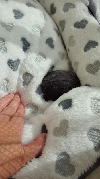 窓際の全く猫が見向きもしない猫ベッドに亀を乗せたら、頭かくして尻隠さずw