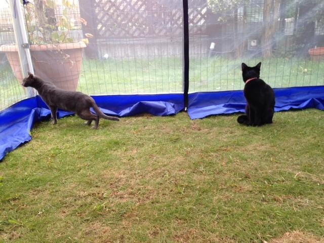 結局、タープを購入してそれを囲う枠組みとして単管パイプで補強することにしました。だけど、メッシュウォールをすると、黒い方の娘は嫌がり、メッシュの外側をウロウロ。まったく意味がないので、仕方なく、外しちゃいました。