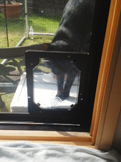 もうひとつお気に入りは、猫の出入り口扉。これ、先日ネコ友達の日記でも登場してました。うちの場合は網戸に取り付けてますが、お友達のところでは別の使い方をされてました。