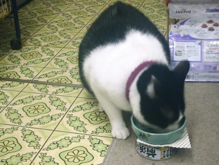 夕べ、七七保に開けてやった缶詰の残りがあったので、入れてやりました。
