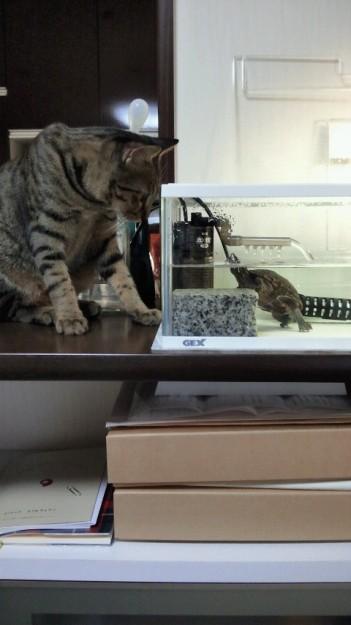 普段、猫達はスルーしていますが、おかめがバシャバシャ音を立てて暴れていると急に見物に来ます。