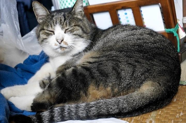 チャムは晴れていれば居間で、曇ってて寒い日は2階の私の布団の上で寝ていますが、今年の半野生児は……