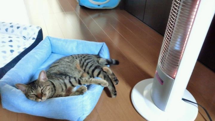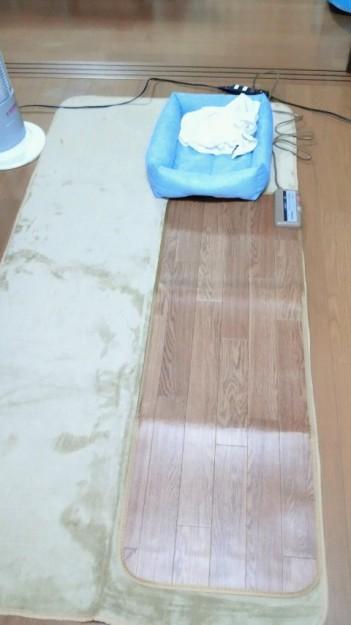 ホットカーペットは、汚されるから止めたほうがいいとか、色々言われて、結局、キッチン用?の45×120くらいのパネルヒーター(8時間自動オフ)をいつも寝ている本棚の上に置こうって事になりましたが…不信がって乗りません(;´∀`)