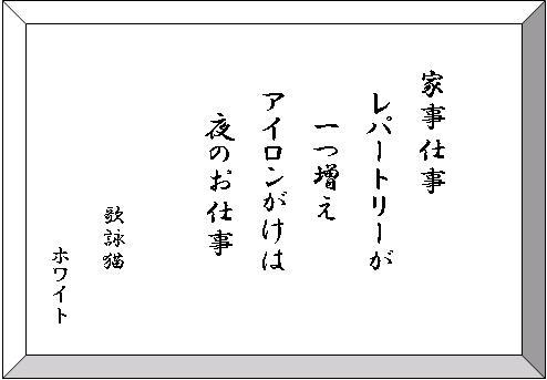 それはアイロン掛け。しわしわのハンカチやカッターシャツなど簡単な物ばかりだけど主婦にとっては毎日の結構な負担になってるみたいだね。主はしわしわが綺麗になるのが面白くて、毎夜洗濯物片付けた後にせっせとやってるよ。感心、感心。