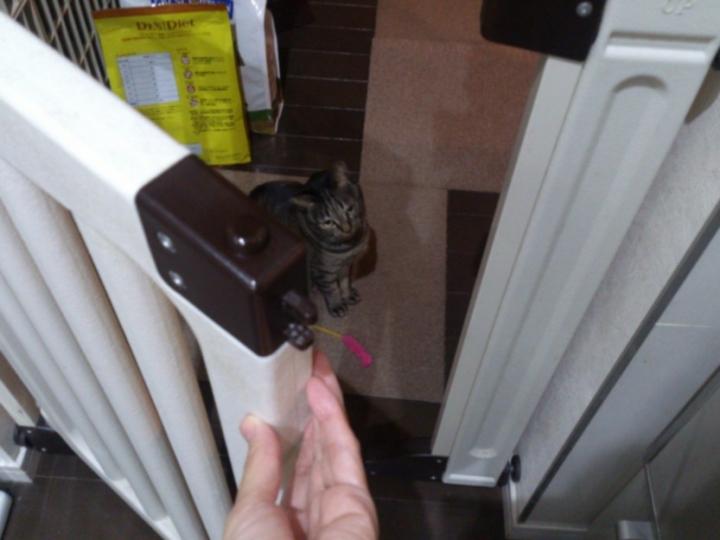 めめが、キッチンに入りたいからベビーゲートの前で待ってみーみーみーみー言っているかと思ったら、おもちゃ投げろって言っていました。