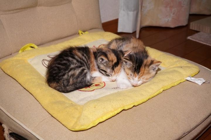 一通り暴れたあとは、仲良くお気に入りの座布団の上でオヤスミ。この寝顔をみると、いたずらも何もかも許せてしまいます!