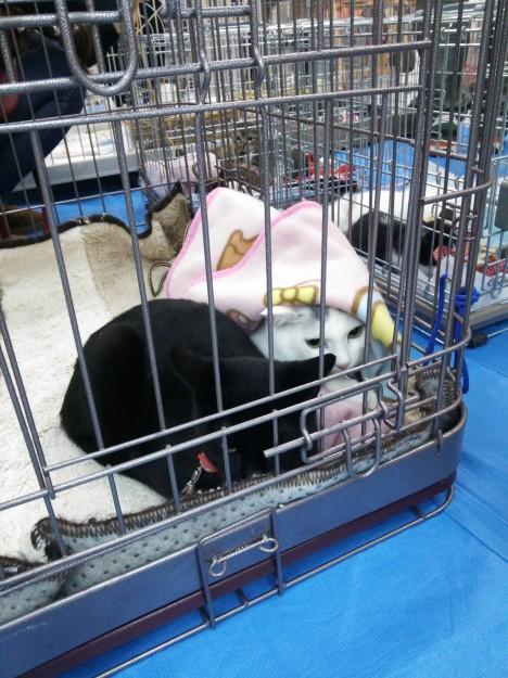 何度か参加させて頂きました周南市でのお見合い会とはまた、ガラッと雰囲気が違い、人もギュウギュウな感じで周りをあちこちの人や猫が移動するのでビクビクさせてしまいました。「わたしは居ません」を決め込んで平らになって床と同化して(いるつもりで)いました。