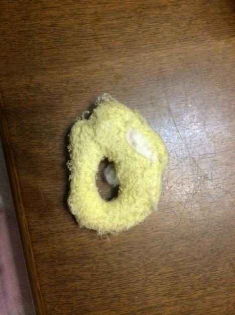 中に鈴が入ってて、生地がタオル地なので、爪にひっかけやすいんですよね。