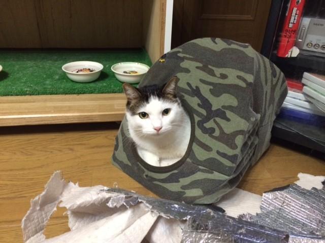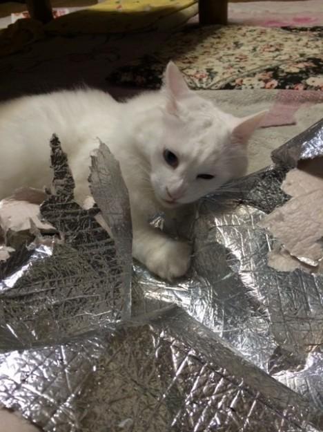 銀シートも夜中にバリバリ音をたてて遊ぶので寝室から居間に引っ越しました。