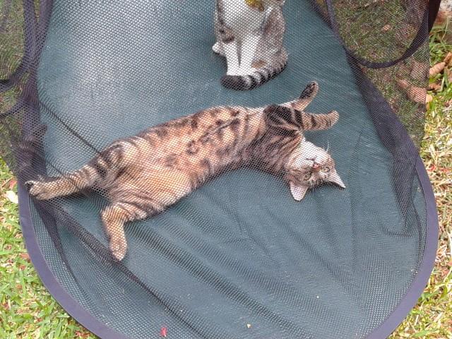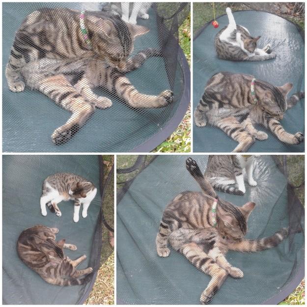 RupiとEuron、Porcupine fish(ふぐにトゲがあるやつ?と思ってググったら、ハリセンボンだって)のようになって、何を思ったか、Rupi塀に飛び乗った!