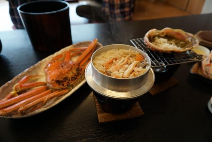 越前町のお店で、茹でカニと焼きカニ、カニ刺、カニ釜飯のセットをたべました。