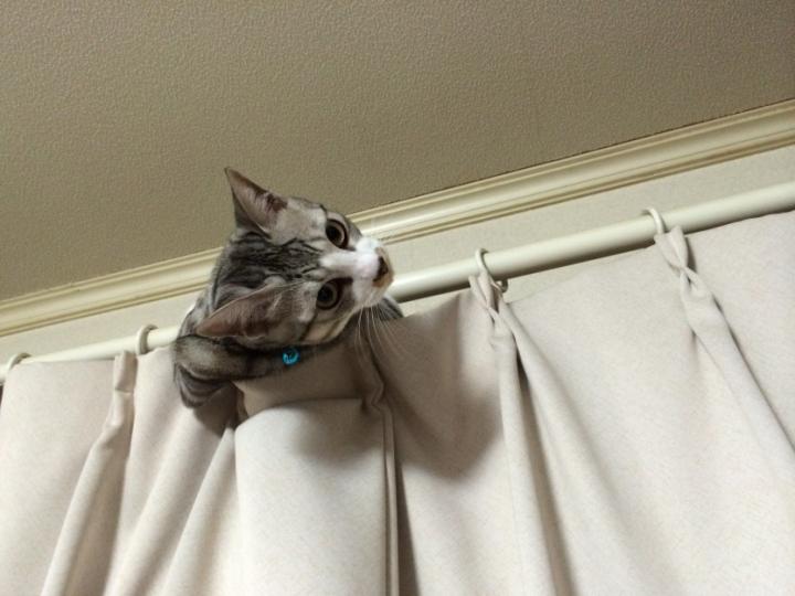 今夜はカーテンを登りカーテンレールの隙間から顏と腕を出したものの・・・