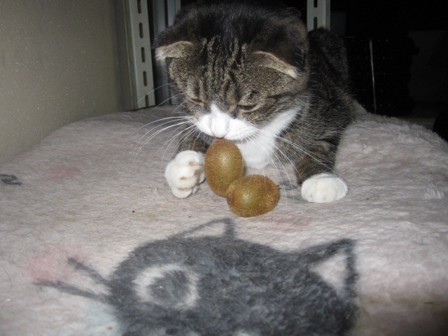 家に帰り、キウイフルーツがまたたび科の植物で反応する猫もいると聞いたことがあるので試してみました。