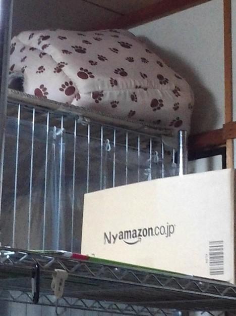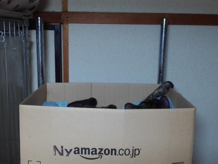 斜め下のにゃまぞんの箱に、猫ハウスが逆さまに嵌っていました。