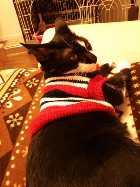 寒そうなハリーにワンコ用セーターを着せてみたところ
