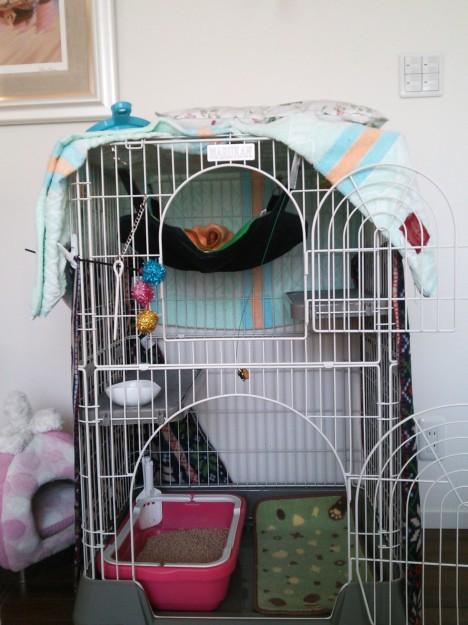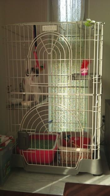 今ではご飯の時と、トイレの時、そして気が向いた時にケージで過ごすの。