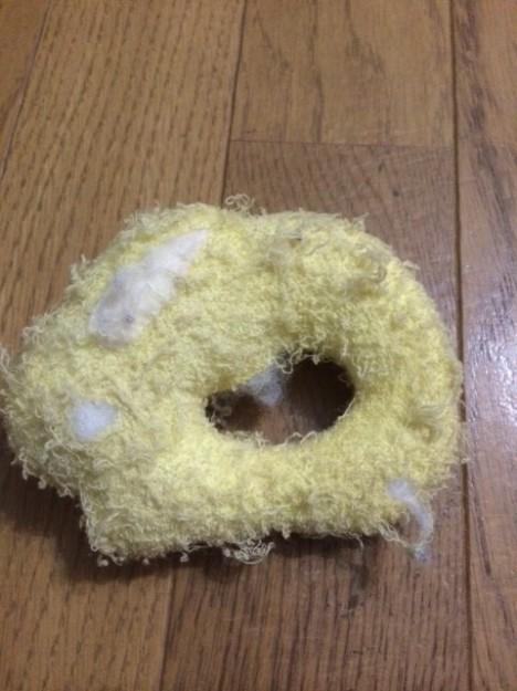 鈴の入っているこのおもちゃも、こんなにボロボロになりました。