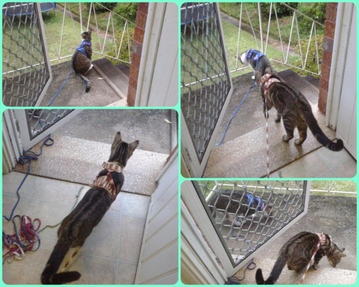 バルコニーを囲ってあるフェンスの外に頭を出したり、