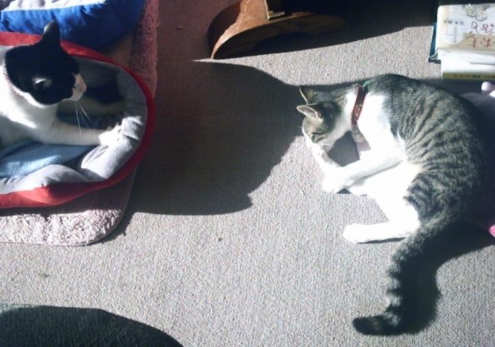 ハチ君と七七保が、ヌクヌクと過ごしてます。