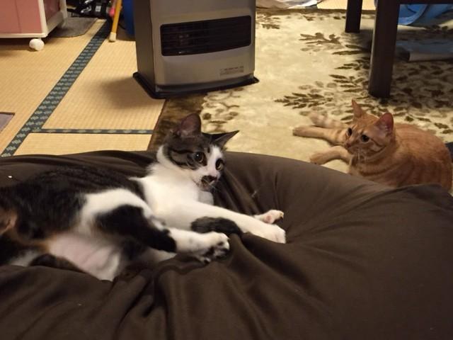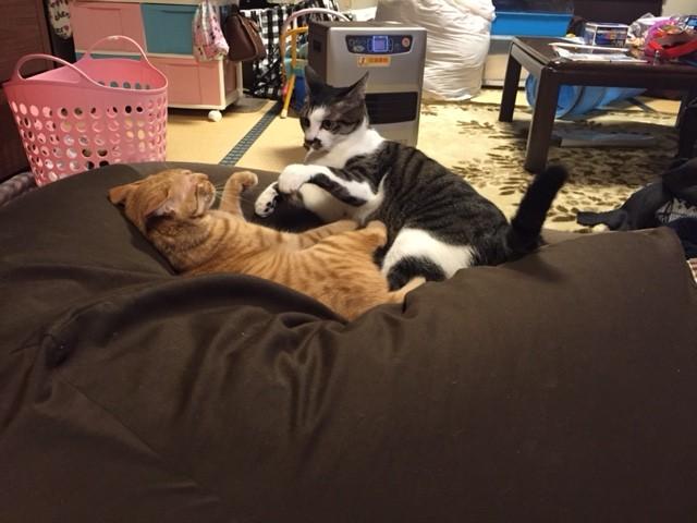 ななが無〇良品のクッションで寛いでいると、そらがやってきて取り合いに。