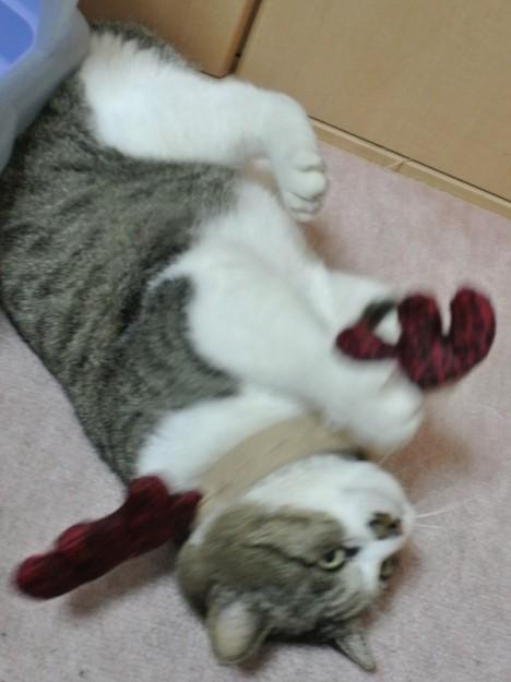 私の膝に乗ってゴロゴロ言ってる時にツノを付けて撮りました。