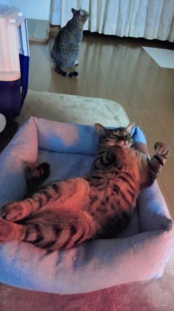 数時間後、本棚の上のちょびを覗くと、目を開けて寝転がってます。