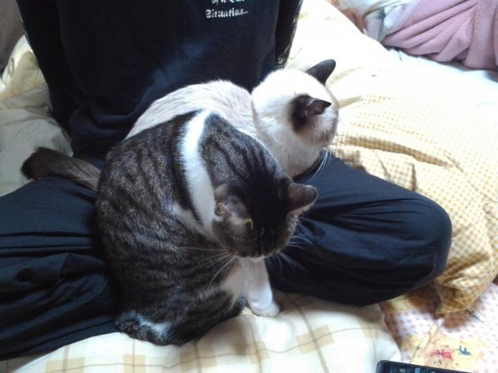 膝の上が猫サンクチュアリ状態で、動く訳に行かないんだそうです。