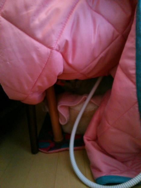 ビスに上から襲われないように、机の下にこたつが入っています。