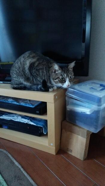 昨日はテレビ台とカーテンの隙間に隠れてましたが…。