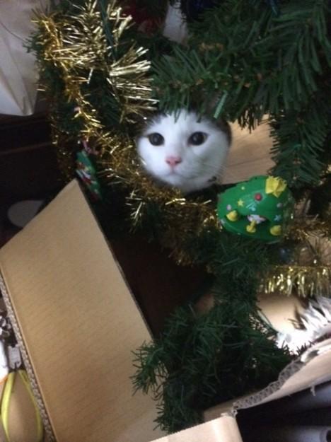 マロはクリスマスツリーの間から顔を出して、