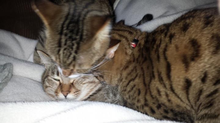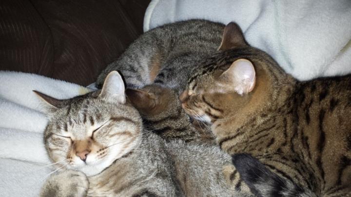 最近はめっきり寒くなったせいか、ニャンズはワタシたちの上で固まって寝ることが増えました。
