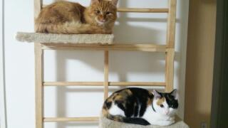 今日は三毛ちゃんと過ごす最後の夜です。仲良くキャットタワーに