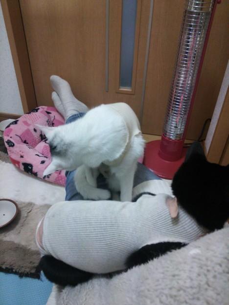 ふたりでお世話係の脚に乗っています、かわいい♡