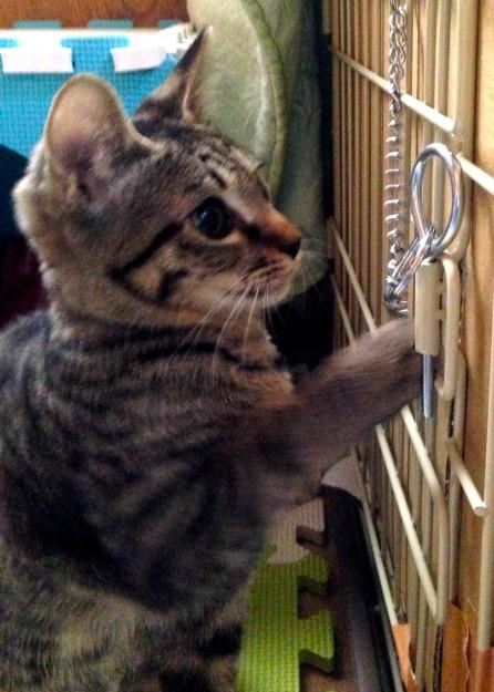 その内にケージのドアの引っかけ鍵の存在に気づき、鍵を咥えて引っ張って開けようとしだし、これはヤバいとケージのある部屋から慌てて追い出しました。