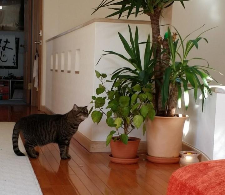 ママしゃん、ツリーないですにゃ…なんだかお外のにおいがしますにゃ…葉っぱをみつめること数分。かなり気になるご様子でした。