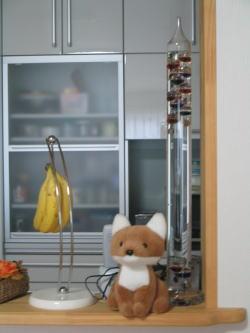 コンちゃんの後ろに立っている、ガラス製の「ガリレオ」という温度計の警備が、コンちゃんのお仕事です。