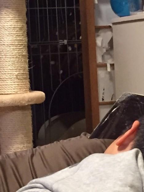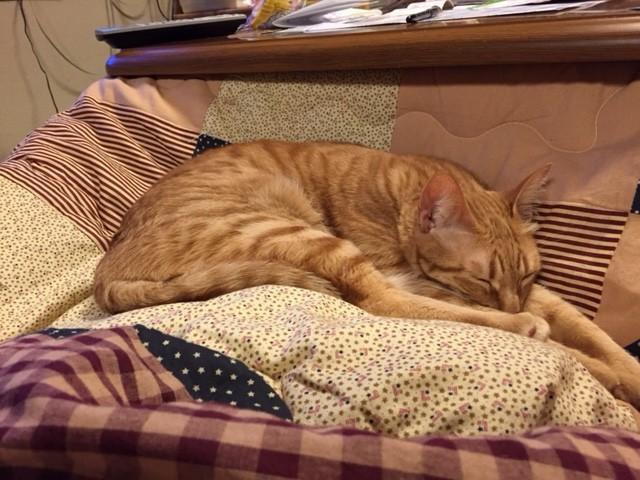 コタツに入ってる私の膝に乗ってきて寝てました。