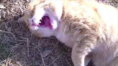 M河原、堤防下の遊歩道脇にて、昼寝をしているところを、軽トラックに追いかけ回され、跳ね飛ばされたブッチ君。
