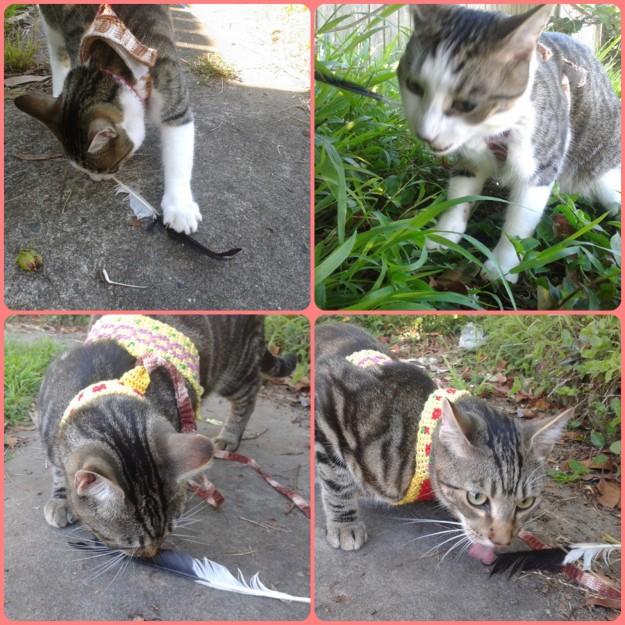 RupiがMagpie(以前日記に載せたカラスのような鳥。白が入っている。巣のそばを通ると人間にも攻撃してくる。)の羽をみつけ、カジカジし出しました。