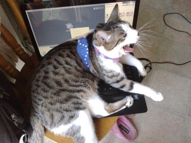 散歩中のにゃんず監視するために ドアの所で椅子の上にPCを置いて