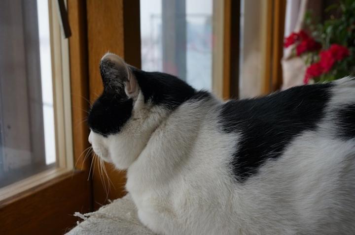 せっかくライカが風呂場の脱衣場に寝に行ったにの、今日はにゃん人気No. 1の出窓スポットにも日差しい入らず。