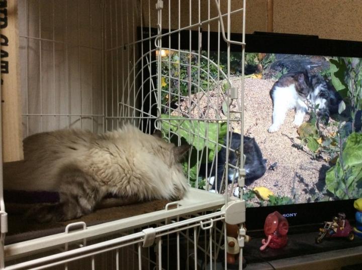 ケージにも自由に登るようになり、岩合さんのテレビを見ながら寛いでいます。