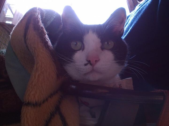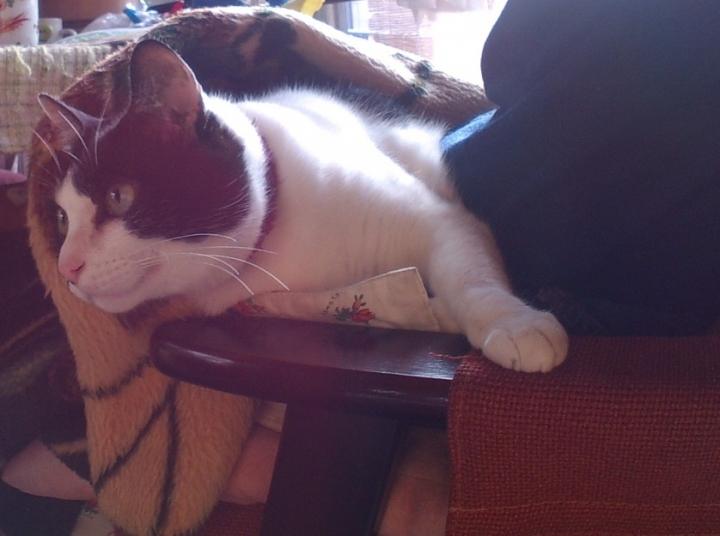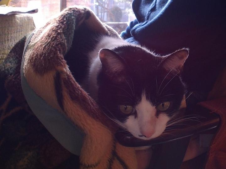 ひざ掛け毛布を被って、朝からヌクヌクする、ハチ君です。