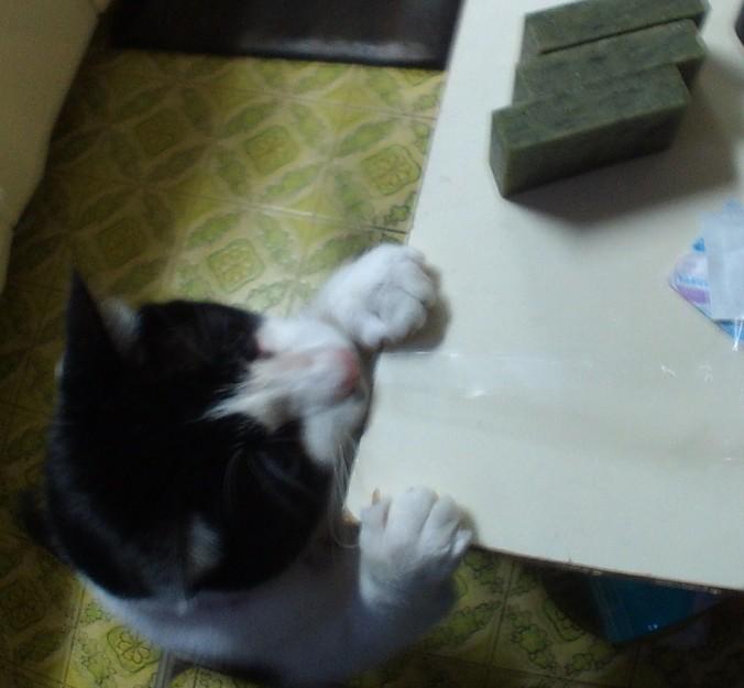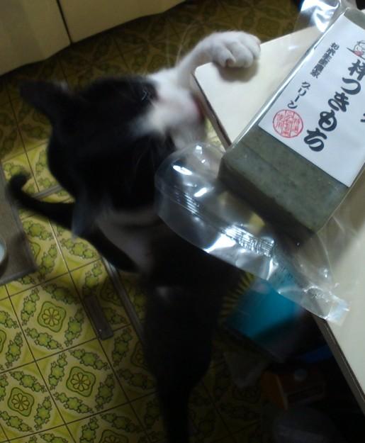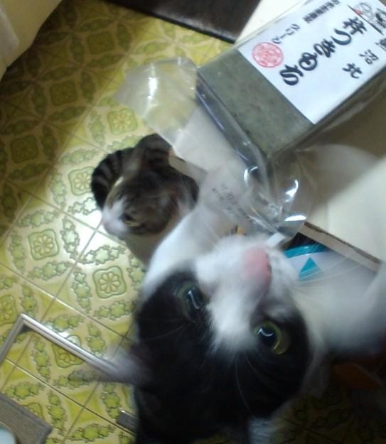 ビニールパックの音に、勘違いして飛びつく、ハチ君と七七保。