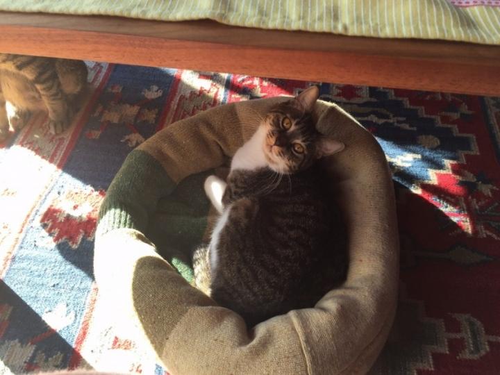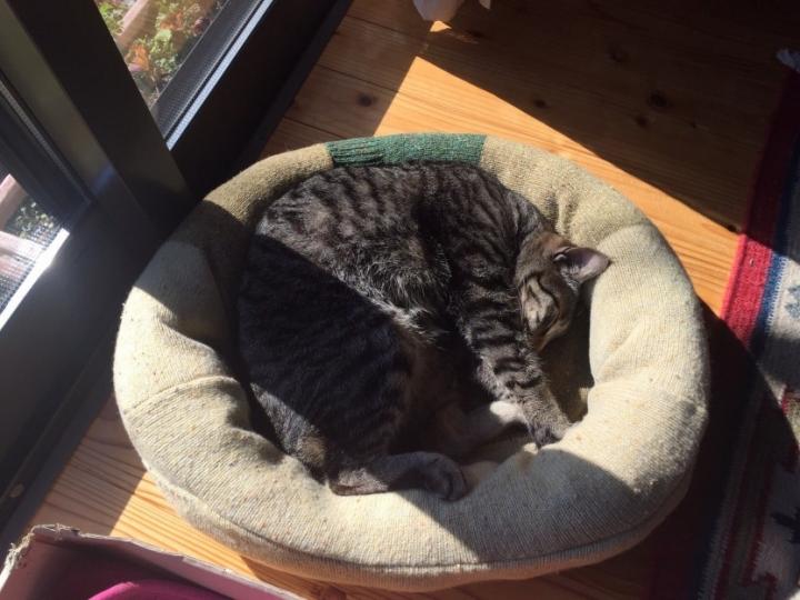 横取りしたギン♂は爆睡中。敏感な😸たちは、買ったものは、素材や匂いを気に入ってくれないこともありますが、これは簡単でオススメですよ。