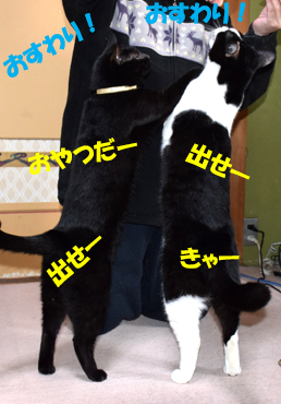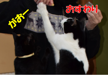ところが、猫さん達が覚えたことは、「お父さんが来る」→「お座りと声掛けされる」→「お座りする」→「おやつが貰える」のうち最初と最後だけでした。