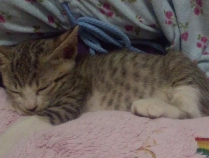 あー君は、カバー写真の3匹より先に迷い込んで、一番に保護した、い〜ちゃんの兄妹。い〜ちゃんは4匹兄妹でした。