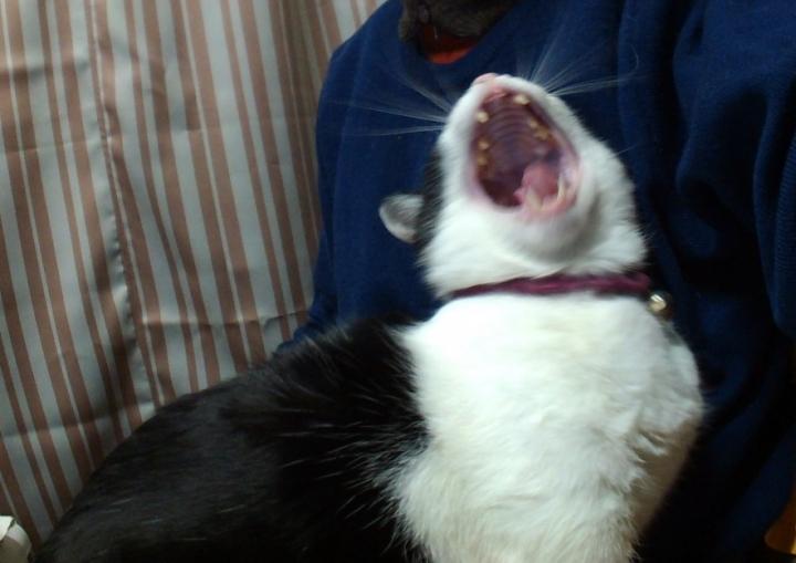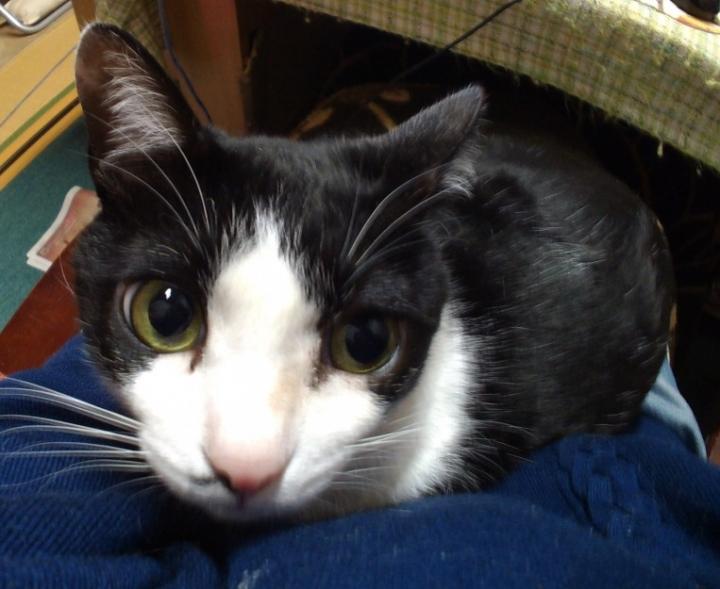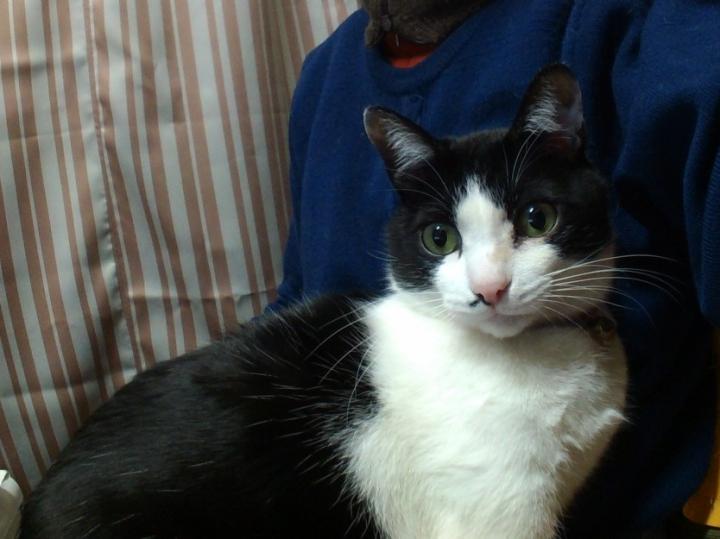 夕食を食べて、少しお茶の間をウロウロした後、おひざに乗りに来たハチ君。