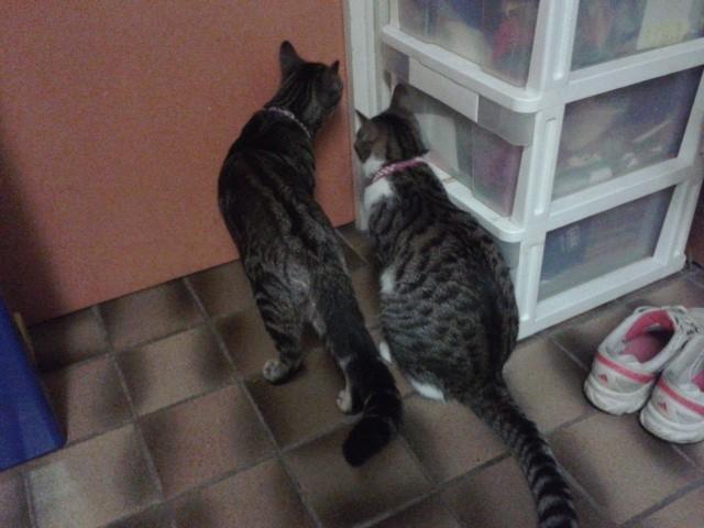 ランドリールームのドアで待機、そしてにゃおにゃお言っているので、